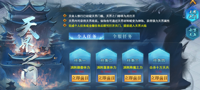 开启条件:开服满60天开启天界之门,完成个人或全服任务且转生满35转即可进入(未完成任务5天后开启)