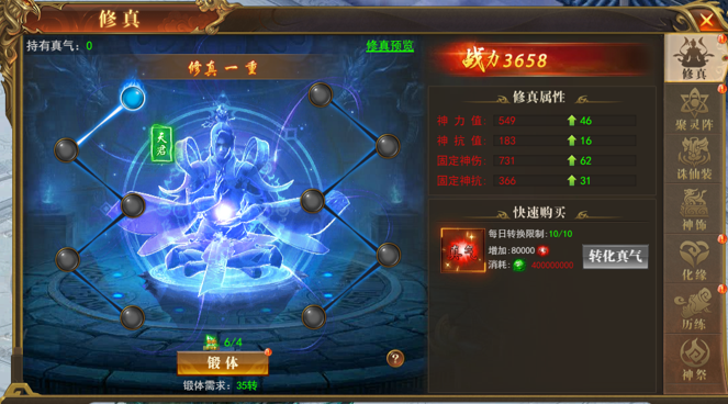 --每锻体10次可消耗真气突破修真等阶,提升修真等阶可进入更多地图还可获得仙位