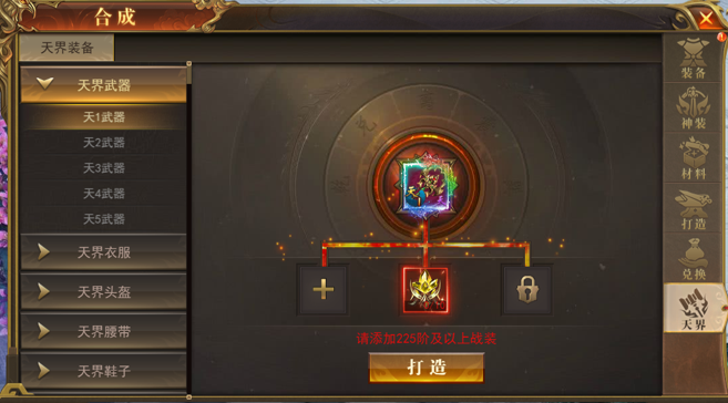 --使用225阶及以上战装和天界材料可打造天界战装,天界战装比普通战装多至尊属性,可获得大量天界大陆属性
