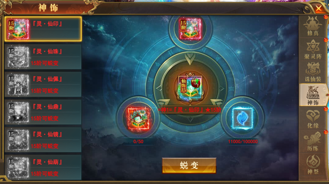 --仙饰满15阶可使用神饰碎片进阶到神饰,获得大量基础属性和天界属性