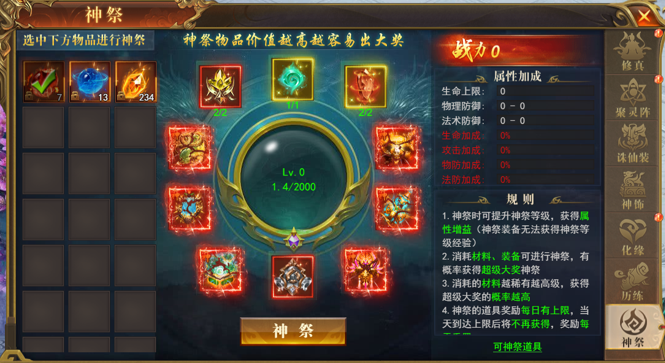 --部分多余的装备、材料可进行神祭,有概率获得神祭超级大奖,消耗的材料越稀有高级获得大奖的概率越大