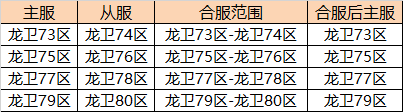 为保证服务器的运行稳定和服务质量,《龙卫传奇》部分区服将进行相关合服工作。预计合服时间为1月13日9:00-10:00。请各位玩家相互转告,并提前留意游戏时间,以免造成不必要的损失。合服结束后可通过原服务器入口进入游戏。对于合服期间给您带来的不便,敬请谅解,感谢所有玩家的支持和配合。
