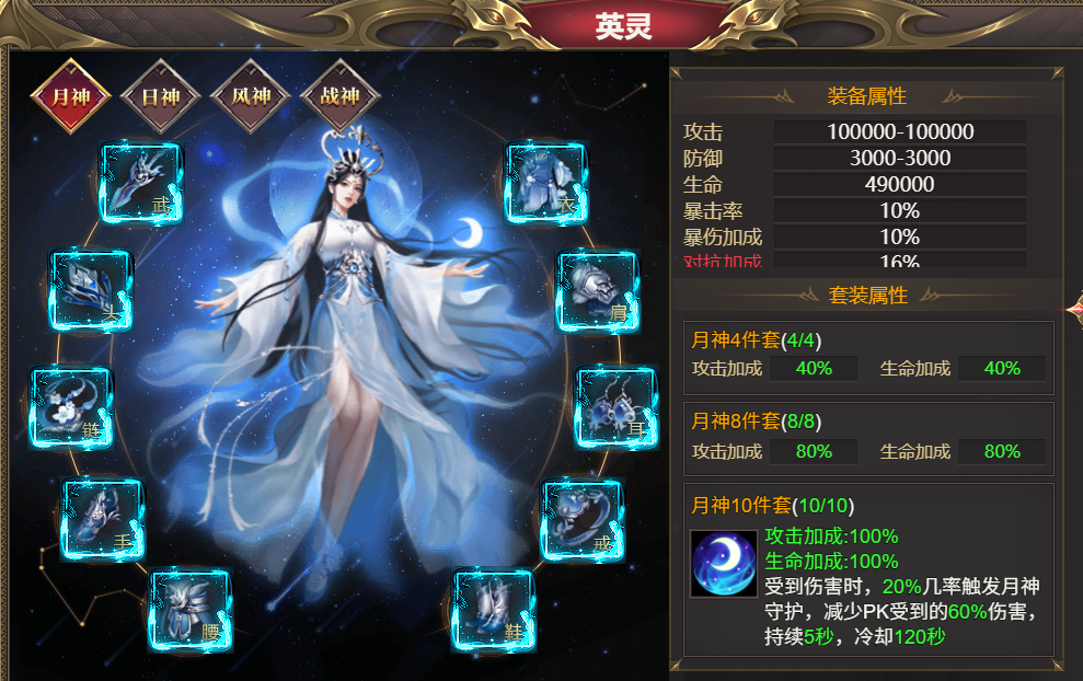 ②英灵装备可在月神、日神、风神、战神四套任意选择