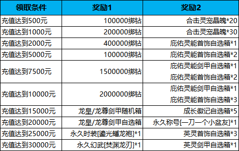 ③如已获得时装[焚渊龙刃]、[鎏光蟠龙袍],奖励将折算成龙皇/龙尊剑甲自选箱*1、100万绑钻;已获得永久称号[一刀一个小盆友],则奖励将折算成100万绑钻