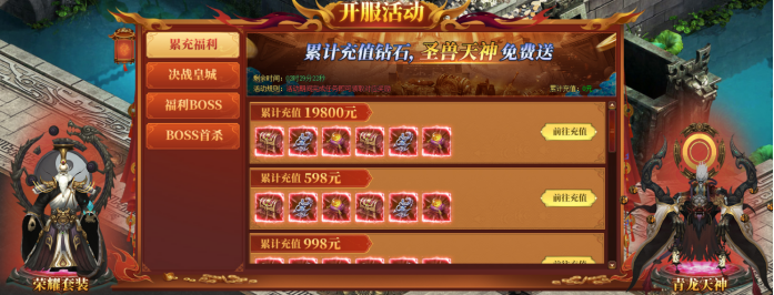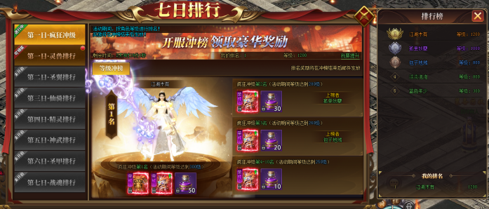 新服前7天每天开启不同的冲榜活动,活动持续7天,冲榜活动包括冲榜、达标、特惠、累充系列活动