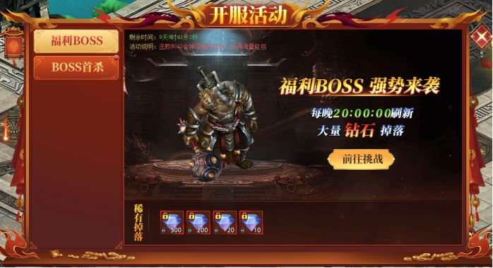 开服前7天的13点、20点会刷出福利BOSS,会掉落大量钻石