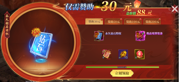 分为4档,充值30元即送永久钻石特权卡