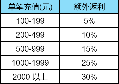 (2)单笔充值达到对应档位可申请对应档次返利(不可叠加获得前面档次奖励)