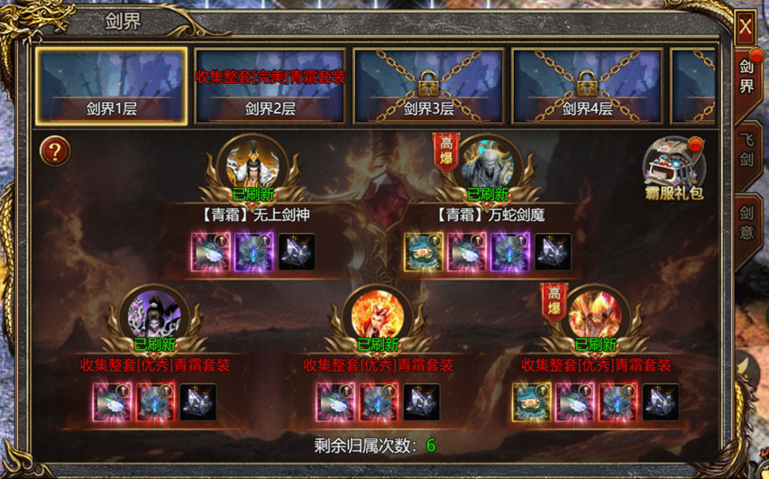 B.剑界BOSS为个人归属,玩家每天有3次归属次数,每天0点刷新,当天未用完的次数次日可叠加,最多叠加至6次。