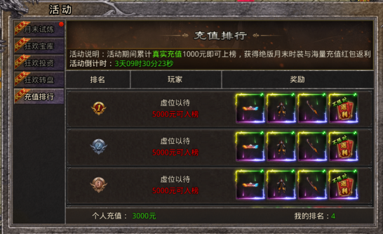 狂欢充值排行,活动期间真实充值排行榜,累计真实充值1000元即可入榜,月末时装、称号,海量红包返利等你来拿!