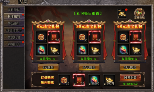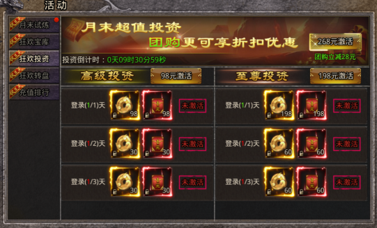 活动期间开启重磅双重投资,只要购买就能在3天拿满全部投资奖励。活动期间98元直购豪华投资,198元直购至尊投资,打包购买268元,立省128元。