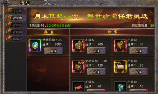 使用狂欢币兑换狂欢宝库奖励,龙印、无双器灵等稀有豪礼等你兑换,机不可失!