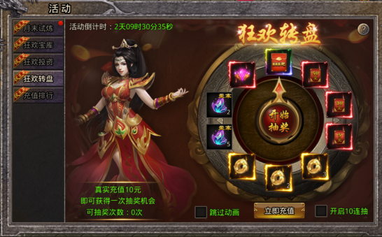 狂欢转盘限时开启,活动期间每真实充值10元,可转动转盘一次,888元红包、专属水晶、主宰宝石、狂欢币等你来拿!