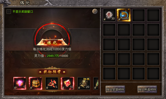 玩家可在炼化系统中将多余材料放入熔炉进行熔炼,获取灵力值,消耗灵力值可以进行炼化获得稀有奖励