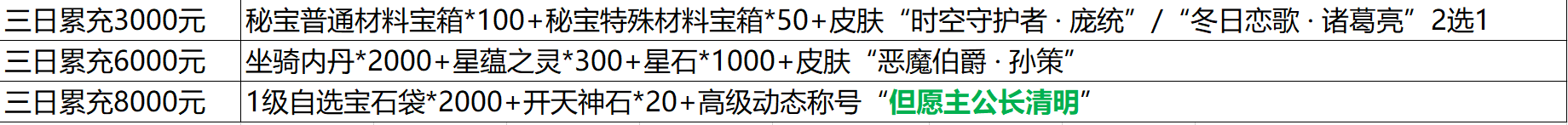 示例:玩家A单日累计充值3000元,可领取单日累充3000元及以下档位奖励,并可领取三日累充3000元的奖励