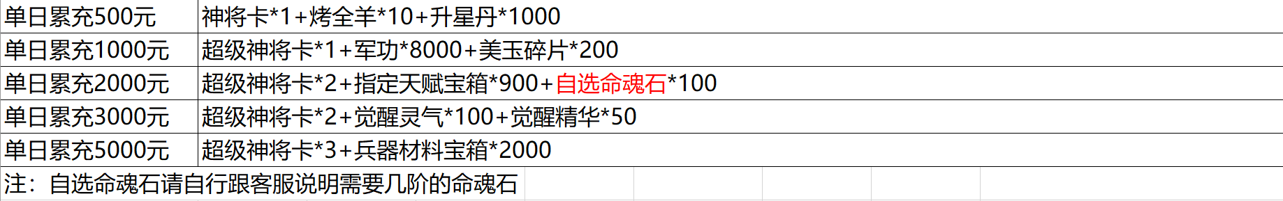 <1> 活动时间内,累计充值到相应档位,即可申请奖励,请各位玩家联系客服进行核实发放。每个档位仅限申请一次