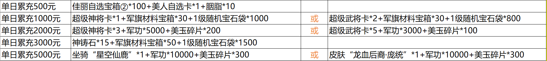 1.活动时间内,单日累计充值到相应档位,即可申请奖励,请各位玩家联系客服进行核实发放