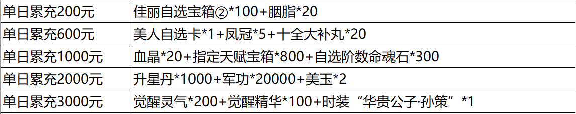 说明:①单日累充金额满足以下条件即可联系客服申请对应奖励;活动奖励为累积奖励,即单日充值3000元可领取所有奖励