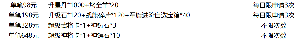 游戏内单笔充值可向客服申请奖励,其中98元和198元每日限申请3次,328元和648元不限次数