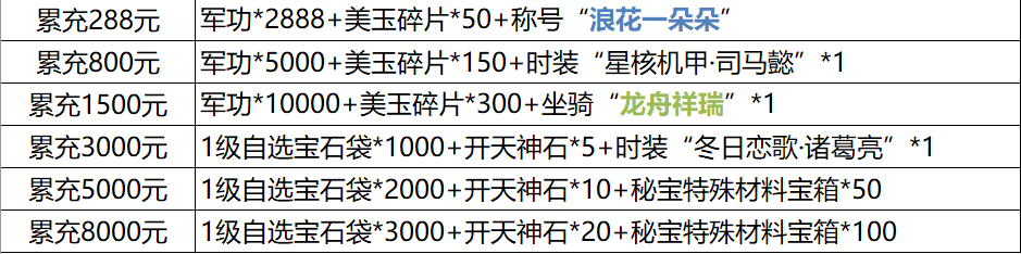 【活动规则】单笔充值指定档位、活动时间内累计充值至一定档位,都可联系客服申请奖励,核实后发放,两者可叠加。