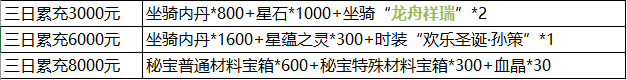 说明:① 三日累充金额满足以下条件即可联系客服申请对应奖励;活动为累积奖励,即三日充值8000元可领取所有奖励