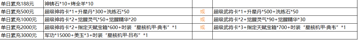 说明:① 单日累充金额满足以下条件即可联系客服申请对应奖励;活动奖励为累积奖励,即单日充值3000元可领取所有奖励
