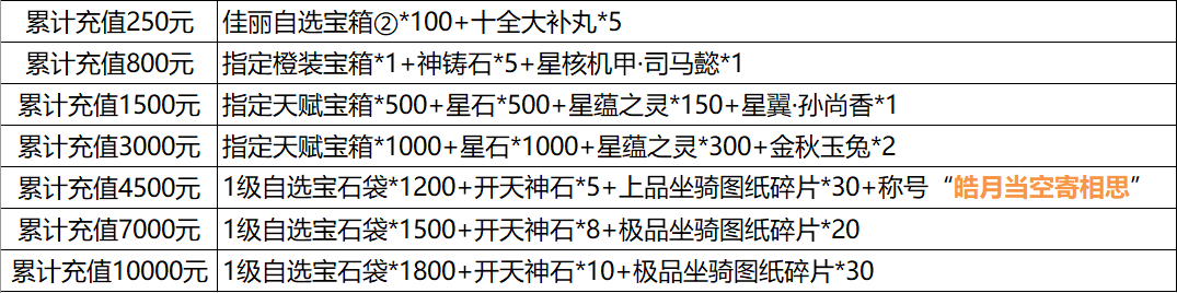 【活动规则】1.单笔充值指定档位、活动时间内累计充值至一定档位,都可联系客服申请奖励,核实后发放,两者可叠加