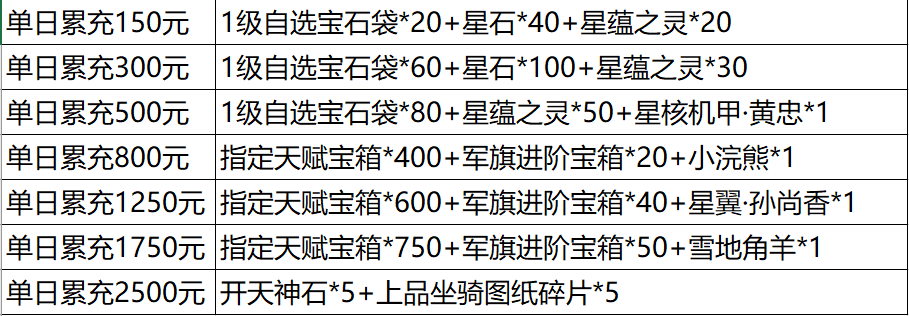 活动奖励为累积奖励,即单日充值2500元可领取所有奖励。仅可申请一次