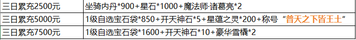 说明:① 三日累充金额满足以下条件即可联系客服申请对应奖励;活动为累积奖励,即三日充值7500元可领取所有奖励