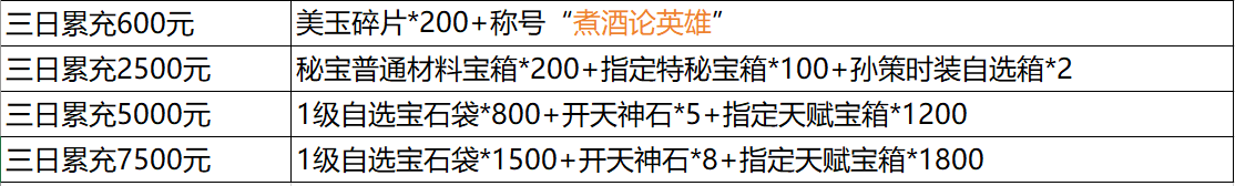 说明:① 三日累充金额满足以下条件即可联系客服申请对应奖励;活动为累积奖励,即三日充值7500元可领取所有奖励