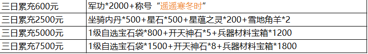 说明:① 三日累充金额满足以下条件即可联系客服申请对应奖励;活动为累积奖励,即三日充值7500元可领取所有奖励