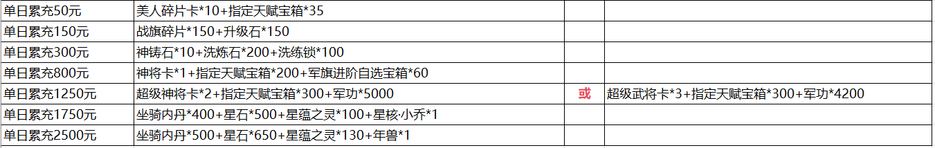 说明:① 单日累充金额满足以下条件即可联系客服申请对应奖励;活动奖励为累积奖励,即单日充值2500元可领取所有奖励