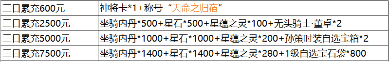 说明:① 三日累充金额满足以下条件即可联系客服申请对应奖励;活动为累积奖励,即三日充值7500元可领取所有奖励