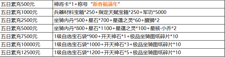 说明:① 五日累充金额满足以下条件即可联系客服申请对应奖励;活动为累积奖励,即五日充值12500元可领取所有奖励