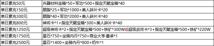 说明:① 单日累充金额满足以下条件即可联系客服申请对应奖励;活动奖励为累积奖励,即单日充值2500元可领取所有奖励