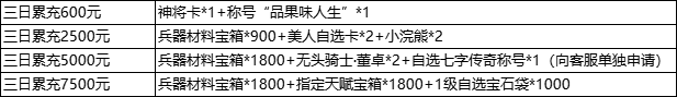说明:三日累充金额满足以下条件即可联系客服申请对应奖励;活动为累积奖励,即三日充值元可领取所有奖励;每个档位仅限申请1次