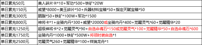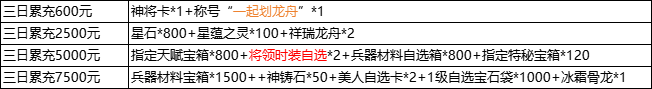 说明:三日累充金额满足以下条件即可联系客服申请对应奖励;活动为累积奖励,即三日充值元可领取所有奖励;每个档位仅限申请1次