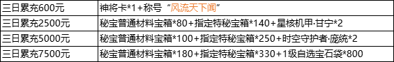 说明:三日累充金额满足以下条件即可联系客服申请对应奖励;活动为累积奖励,即三日充值元可领取所有奖励;每个档位仅限申请1次
