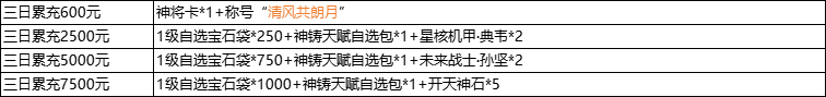 说明:三日累充金额满足以下条件即可联系客服申请对应奖励;活动为累积奖励,即三日充值元可领取所有奖励;每个档位仅限申请1次