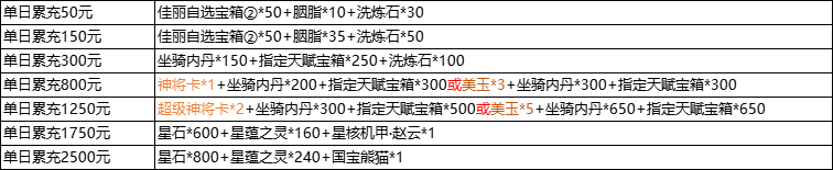 说明:① 单日累充金额满足以下条件即可联系客服申请对应奖励;活动奖励为累积奖励,即单日充值2500元可领取所有奖励