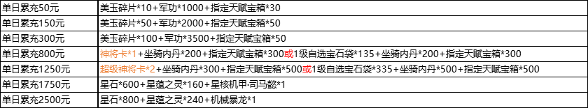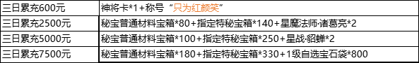 说明:三日累充金额满足以下条件即可联系客服申请对应奖励;活动为累积奖励,即三日充值元可领取所有奖励;每个档位仅限申请1次
