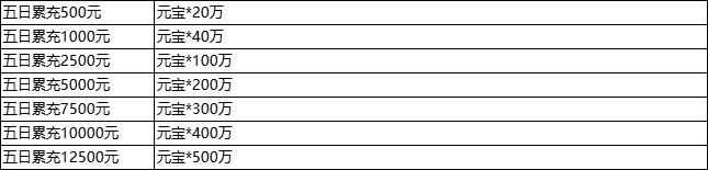 说明:① 五日累充金额满足以下条件可额外获得元宝返利。各档位返利元宝不能累加领取,只能领取最高那个档位的元宝