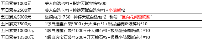 ②. 活动为累积奖励,即五日充值12500元可领取所有奖励,每个档位仅限申请1次