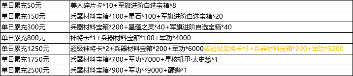 说明:①. 单日累充金额满足以下条件即可联系客服申请对应奖励;活动奖励为累积奖励,即单日充值2500元可领取所有奖励