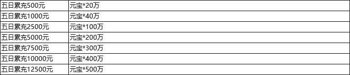 说明:① 五日累充金额满足以下条件可额外获得元宝返利。各档位返利元宝不能累加领取,只能领取最高那个档位的元宝