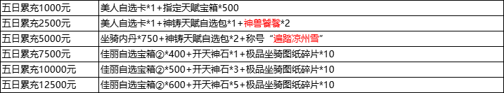 ②. 活动为累积奖励,即五日充值12500元可领取所有奖励,每个档位仅限申请1次