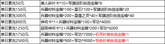说明:①. 单日累充金额满足以下条件即可联系客服申请对应奖励;活动奖励为累积奖励,即单日充值2500元可领取所有奖励