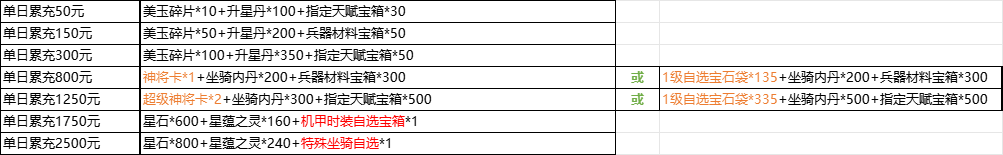 说明:三日累充金额满足以下条件即可联系客服申请对应奖励;活动为累积奖励,即三日充值元可领取所有奖励;每个档位仅限申请1次