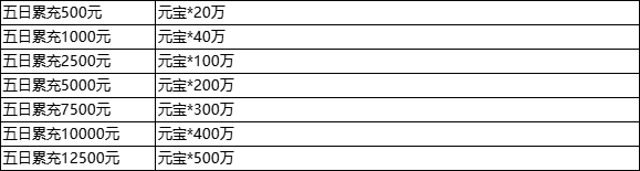 说明:① 五日累充金额满足以下条件可额外获得元宝返利。各档位返利元宝不能累加领取,只能领取最高那个档位的元宝
