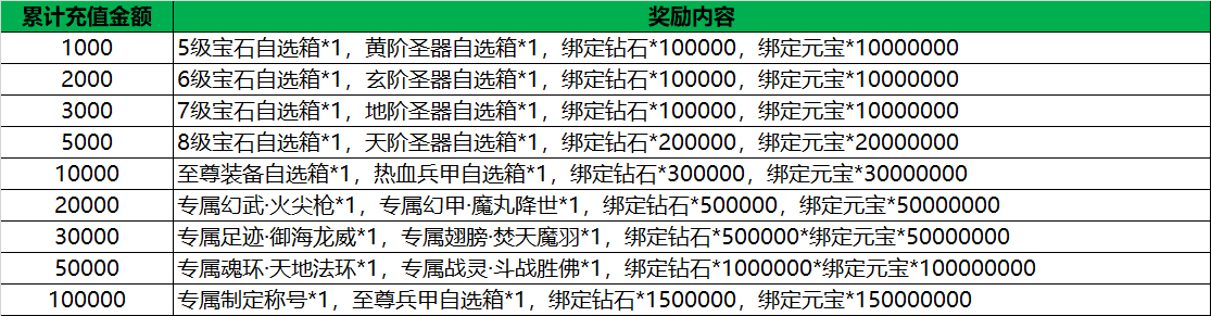 1.玩家创角后开始计算累计充值金额,当累充金额达到对应档次,可申请相应礼包(只计算游戏中真实充值)